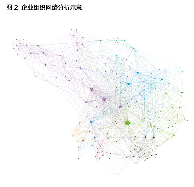 从图2中我们可以看出,在协作网络中不同员工对企业协作的贡献度差别非常大,整个公司的协作依赖于少数明星员工。这些明星员工对企业有着非常大的溢出影响。进一步分析这些关键员工,还可以发现有些员工处于跨部门交叉的节点上,说明这些员工在跨部门协作中起到关键作用。研究表明跨领域、跨部门交叉节点的网络连接往往是企业创新最活跃的区域。