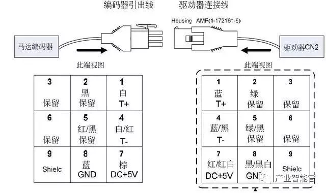从上图看出九个端子我们只使用了5个,一个屏蔽线、电源线两根、串行通讯信号(+-)两根,与我们普通的编码器接线差不多。