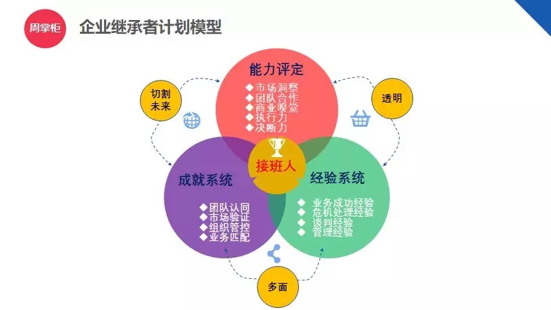 本模型用于动态衡量企业继承人的能力、潜力和胜任力,也是市场洞察中潜在的调研维度。总体看,周掌柜咨询认为“能力评定”、“经验系统”和“成就系统”三者对于评价接班人不可或缺。但同时,继承者计划也需要匹配组织战略和相应的管理架构配合接班人计划有序展开。
