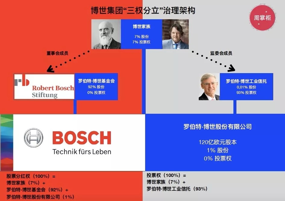 再次对比享誉世界的企业博世集团。博世于1942年3月12日凌晨去世,在他身后几位高管一直致力于维护创始人的遗愿,为了确保公司的独立。1964年,博世领导层认为时机已经成熟,再次进行了改制:首先,让于1921年成立的主要用来管理创始人股权的博世资产管理股份有限公司收购了博世家族掌握的大部分公司股权,持有92%的股份。1969年,博世资产管理股份有限公司改制成为非盈利机构——罗伯特·博世基金会,拥有92%股份的分红权,而其92%股份的投票权则转移到了新成立的罗伯特·博世工业股份有限公司。罗伯特·博世工业股份有限公司又和罗伯特·博世股份有限公司合并成为罗伯特·博世工业信托两合公司,掌握93%的投票权,全权负责公司的业务决策。而公司剩余的7%的股份分红权与其相应的投票权则保留在博世家族手中。如图:博世家族拥有一小部分博世的收益分配权,但企业由奋斗者掌控,最大利益回馈基于服务公众的博世基金会。这个管理架构也很有意思,就是让家族通过基金会的方式间接管控公司,同时让企业以独立的法人形式交给下一代企业家永续经营。如图:
