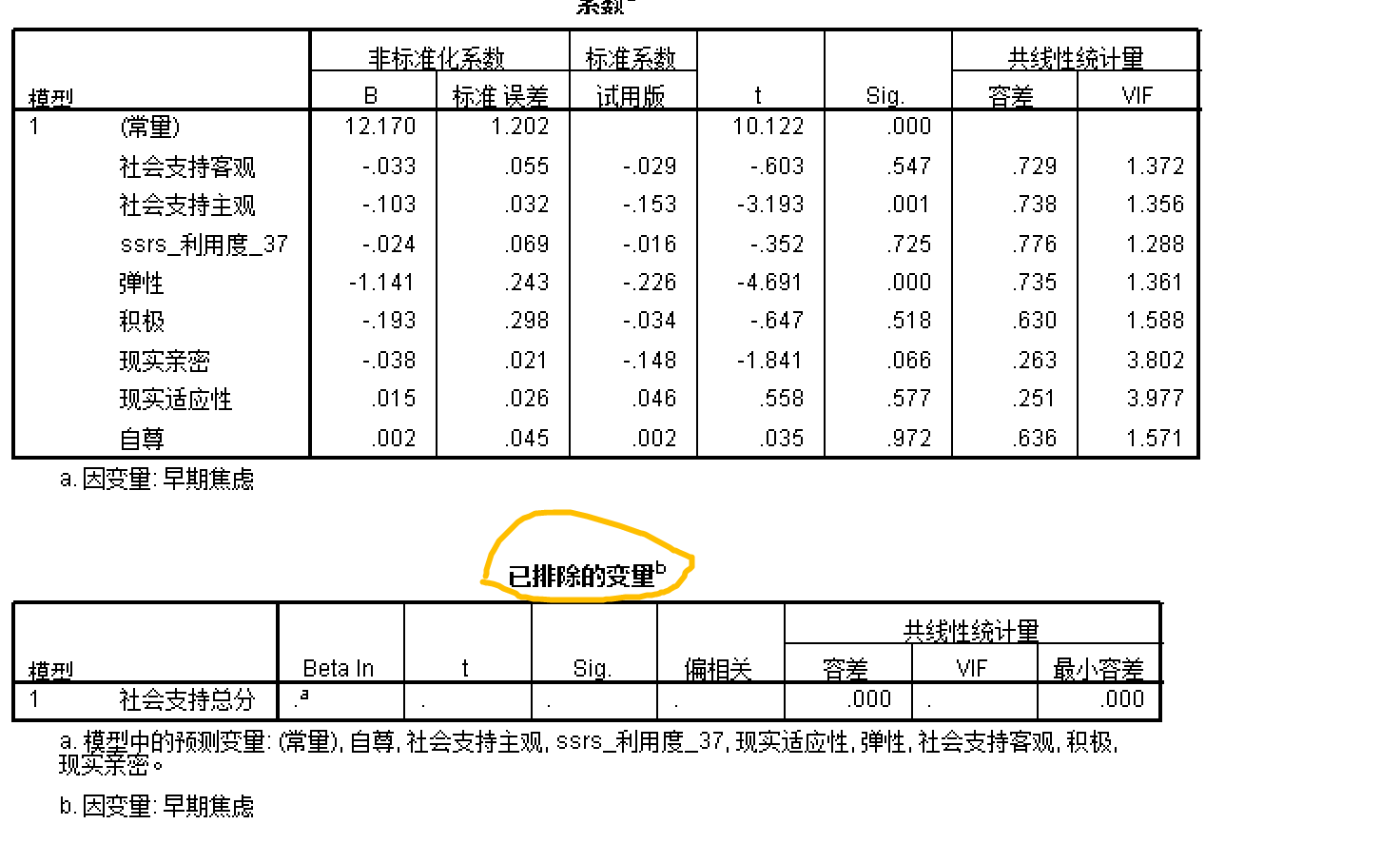 社会支持总分一开始就被剔除了(这里使用enter法)。