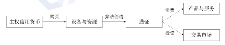 在数字经济视角下,主权信用货币成为新增通证的一种外部输入源。而智能合约如央行般发行通证,通证可被用于消费和投资。因此通证的状态主要有三种:1)以数字形式被持有;2)通过消费行为进行交易;3)兑换为货币退出流通。