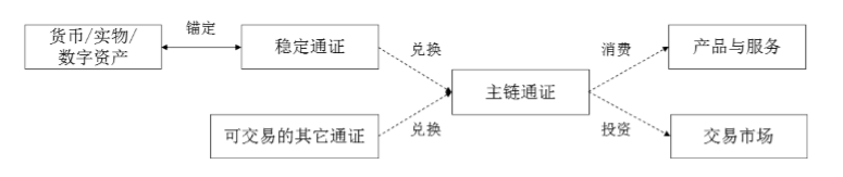 在 SimpleChain 体系下,通证主要分为主链通证、子链稳定通证以及子链非稳定通证三类。而稳定通证以锚定信用货币、实物资产或数字资产而发行,这让货币、稳定通证和非稳定通证形成了相互可兑换的流通关系,如下图所示: