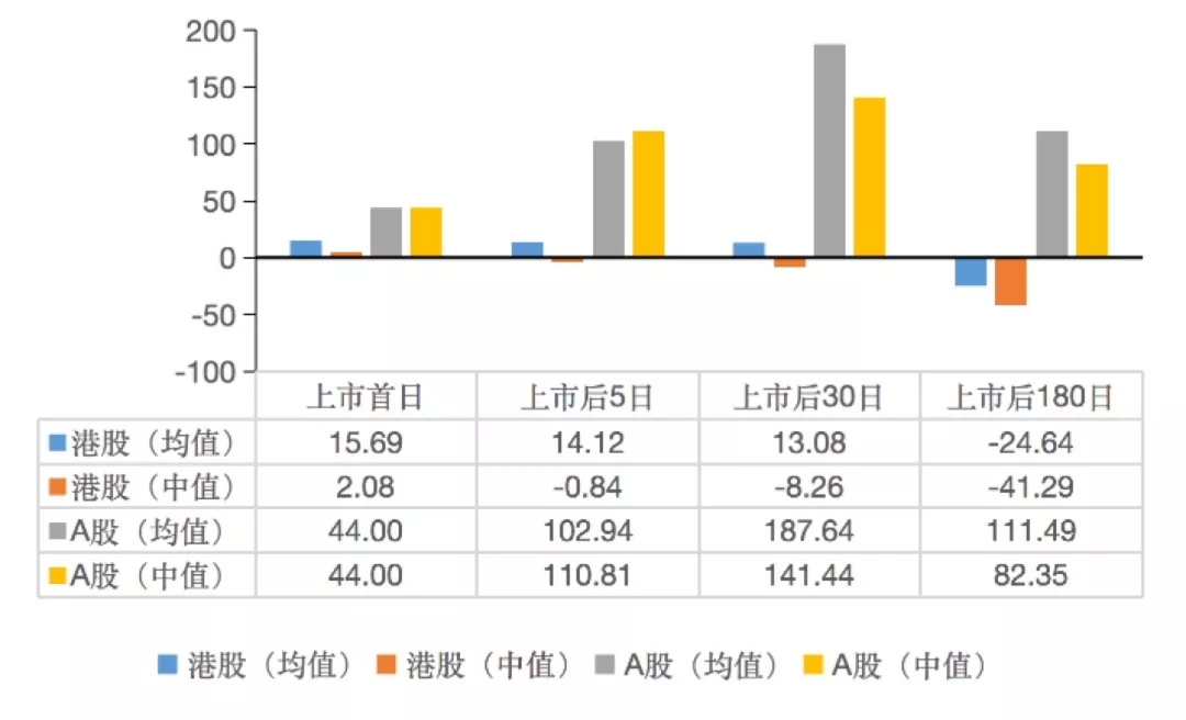 上市5日后,A股平均涨幅为102.94%,上市后30日涨幅为187.64%,而港股上市5日后的涨幅中值跌破发行价。
