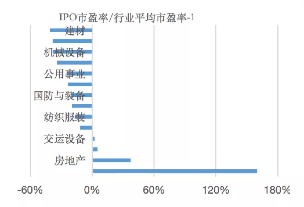 计算2018年IPO的行业平均市盈率,进一步用“IPO行业平均市盈率/对应行业平均市盈率-1”衡量首发市盈率偏离行业平均市盈率的程度,见图3。