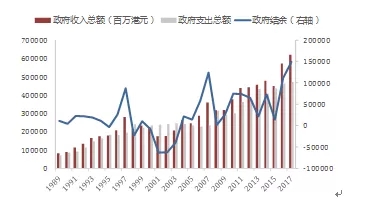 香港历来有实行审慎的财政政策的传统。《中华人民共和国香港特别行政区基本法》第107条规定:“香港特别行政区的财政预算以量入为出为原则,力求收支平衡,避免赤字,并与本地生产总值的增长率相适应”。1989年至今,香港仅在亚洲金融危机后的几年出现了赤字,其余时间均为财政盈余状态(图4)。
