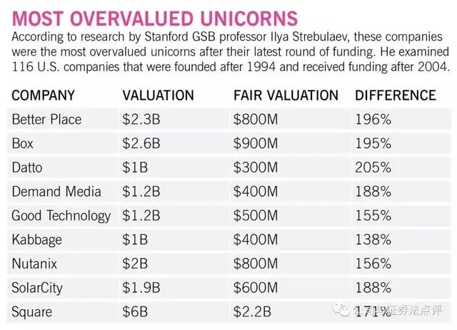 两位教授随后建立了自己的估值模型,即充分考虑每个类别股份权利的不同,以及对估值的影响,来重新计算美国100多家所谓独角兽企业的估值。在美国,平均每家独角兽企业有八个类别的股份。根据他们的测算,在135家独角兽企业中,所有企业的价值都被高估了,高估程度从5%到187%不等。按照他们的方法,很多企业根本达不到独角兽标准,是伪独角兽。