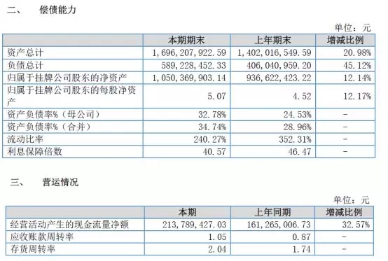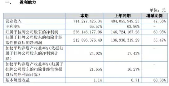 金达莱2018年营业收入达到7.14亿元,比2017年增长了将近50%,公司发展速度相当迅速。在营业收入快速增长的同时,金达莱的毛利率也提高了1.5个百分点,达到65.57%,整体毛利水平也是相当高的。高毛利带动净利润增长了60.95%,2018年净利润为2.36亿元。金达莱的财务状况也是极其健康的,2018年合并口径的资产负债率只有34.74%,流动比率为240.27%,经营活动现金流量净额与净利润相当。