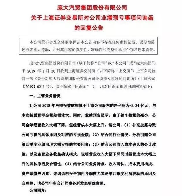 关于亏损,庞大集团在回复上海证券交易所问询函时做出了如下解释:由于销售数量的减少,公司全年经营收入大幅下降,但经营成本大幅上升。