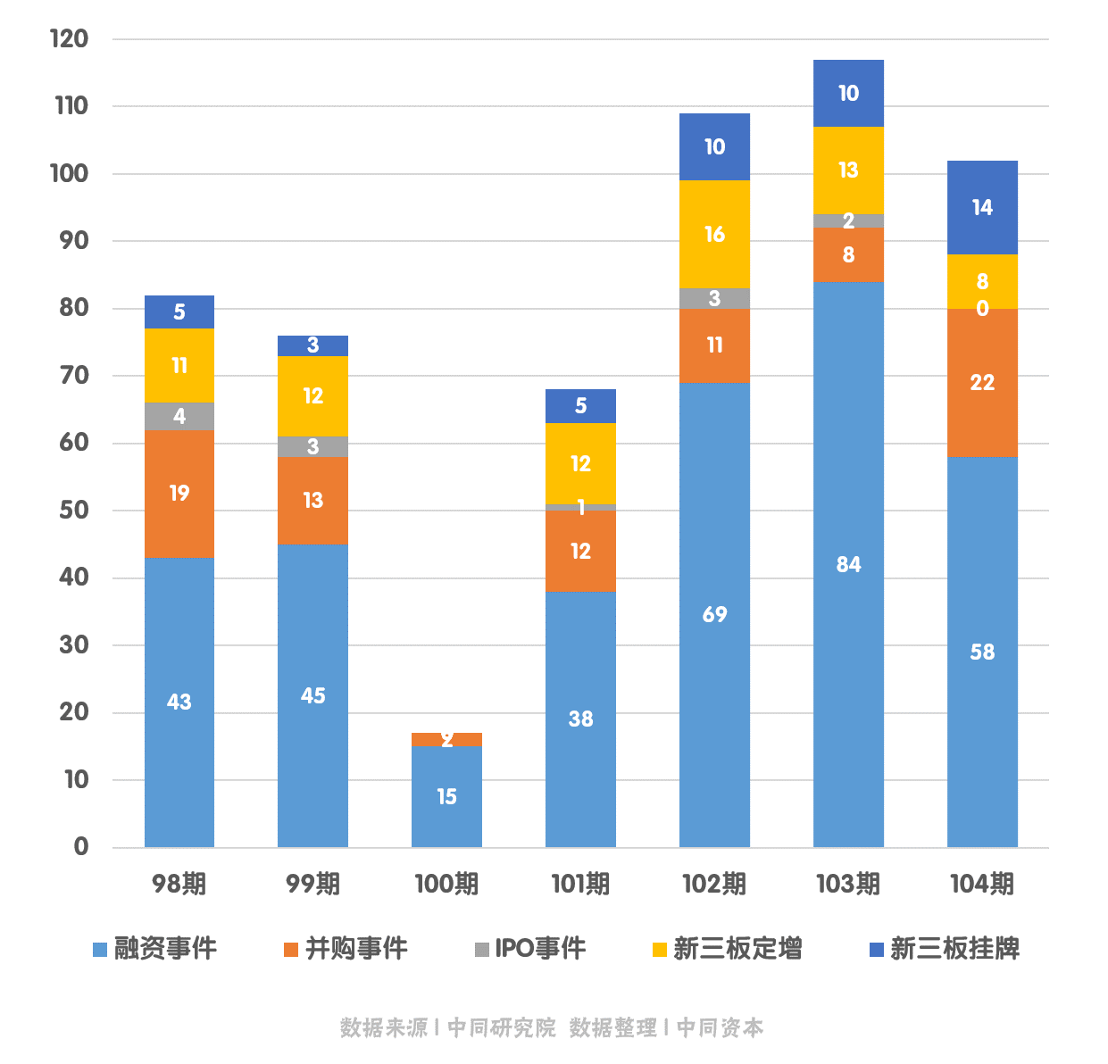 本周国内共发生投融资事件 58 起,并购事件 22 起,IPO事件 0 起,新三板定增 8 起,新三板挂牌 14 起。