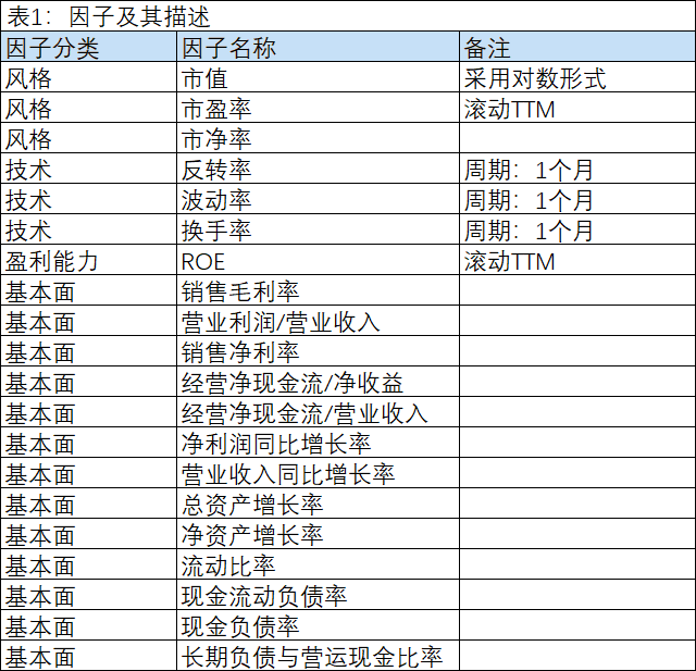 本文基于海通证券研报的内容,选取四大类因子(风格类、技术类、盈利能力类、基本面类)作为所选研究因子。具体如下表: