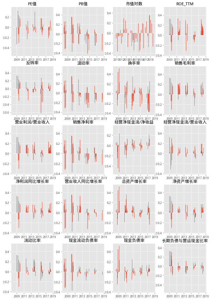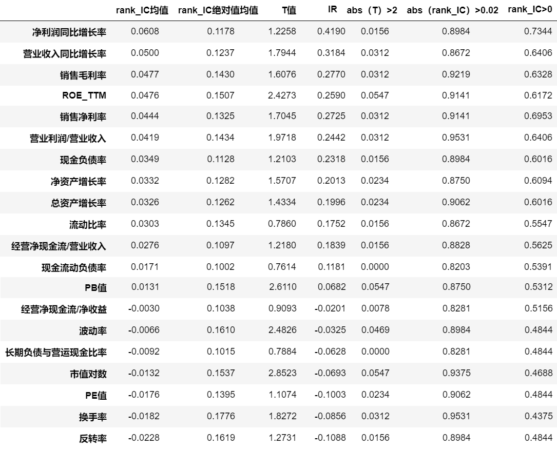 可以看出:风格类因子(典型如PB值、市值对数)在后期逐渐出现反转趋势。技术类因子与收益率大体呈反向关系。基本面因子中,销售毛利率、净利润同比增长率、销售净利率等具有出色表现,而经营净现金流/净收益、经营净现金流/营业收入等效果不显著。
