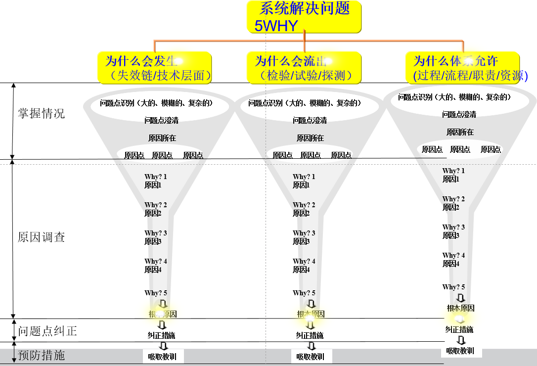 所谓5why分析法,又称“5问法”,也就是对一个问题点连续以5个“为什么”来自问,以追究其根本原因。也被称作为什么-为什么分析,它是一种诊断性技术,被用来识别和说明因果关系链。它的根源会引起恰当地定义问题。这种方法最初是由丰田佐吉提出的;后来,丰田汽车公司在发展完善其制造方法学的过程之中也采用了这一方法。目前,该方法在丰田之外已经得到了广泛采用,并且现在持续改善法(Kaizen),精益生产法(leanmanufacturing)以及六西格玛法之中也得到了采用。