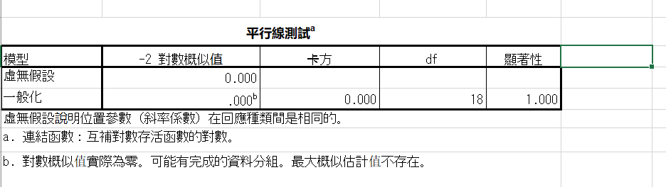 SPSS有序多分类logistic回归模型 平行线检验 用补体对数为连接函数,但 p值为1 卡方为0 怎么理解?还可以继续做有序多分类的logistic吗?