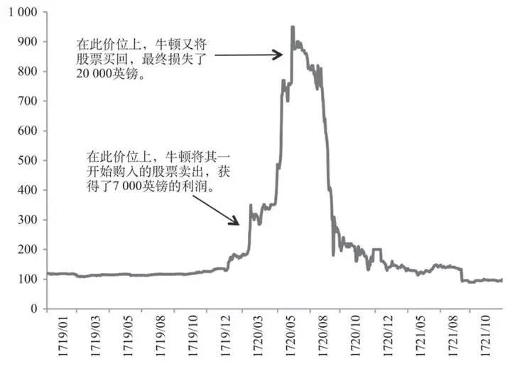 如下图所示,人类有史以来数一数二的天才--牛顿,在这个价位上将股票出售,获得7000英镑的合理利润,但股票价格继续上涨。