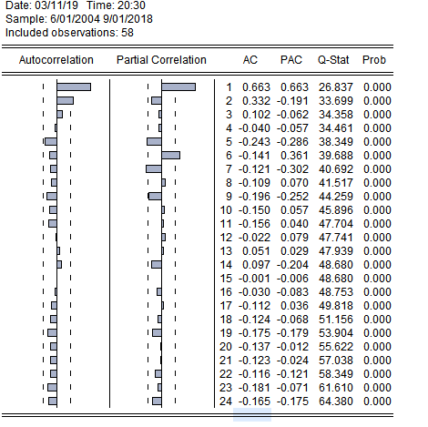 自相关性检验图如下,请问这是几阶相关性(总感觉这数据不对劲)还有如果用广义差分法修正的话,命令是输入最大的阶数,还是依次输入