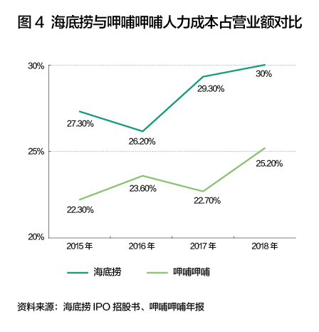 更令人担忧的是人力成本。“狼性”制度实施后,海底捞的人力成本悄然攀升到营业额的30%,每年高达31亿元,远高于同业,未来还可能会更高(图4)。海底捞自创业以来,一直致力于让来自农村的员工有一份体面的收入,但不可忽视的是,餐饮业固有的人力结构决定了很大比例的员工被安排在洗菜、洗碗、配菜等岗位,这意味着计件制工资制度下的海底捞,将不菲的人力成本投入在许多低价值环节。