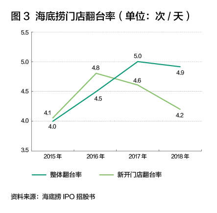 狼性十足的制度意图明确,直指运营效率和服务质量。门店与门店之间、店长与店长之间、店员与店员之间,处处充满竞争的味道,所有人都像上紧了发条,力求工作高效并让顾客满意。从某些方面看,制度似乎是奏效的,门店总体翻台率得到提升。但仔细对比可以发现,新开业的门店翻台率在快速下降(图3)。这似乎暗示着,在快速扩张背景下,狼性制度能够起到一定的激励作用,但对大量缺乏经验的新员工们并不总是奏效。