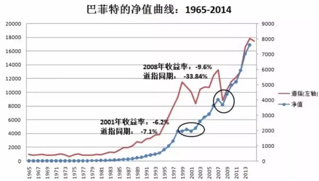 他最大的成就,就是在1957年到2010年这54年间,他的伯克希尔·哈撒韦公司只有2年出现亏损,而且跌幅远比指数要小,一年不到7%,一年不到10%。而他的年复合收益率,为22.67%。