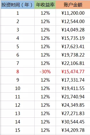不过,如果中间发生了一个意外,比方说,在前面7年中一直保持12%的年收益率,但在第8年情况有变,损失了30%,后面继续保持之前的收益率。