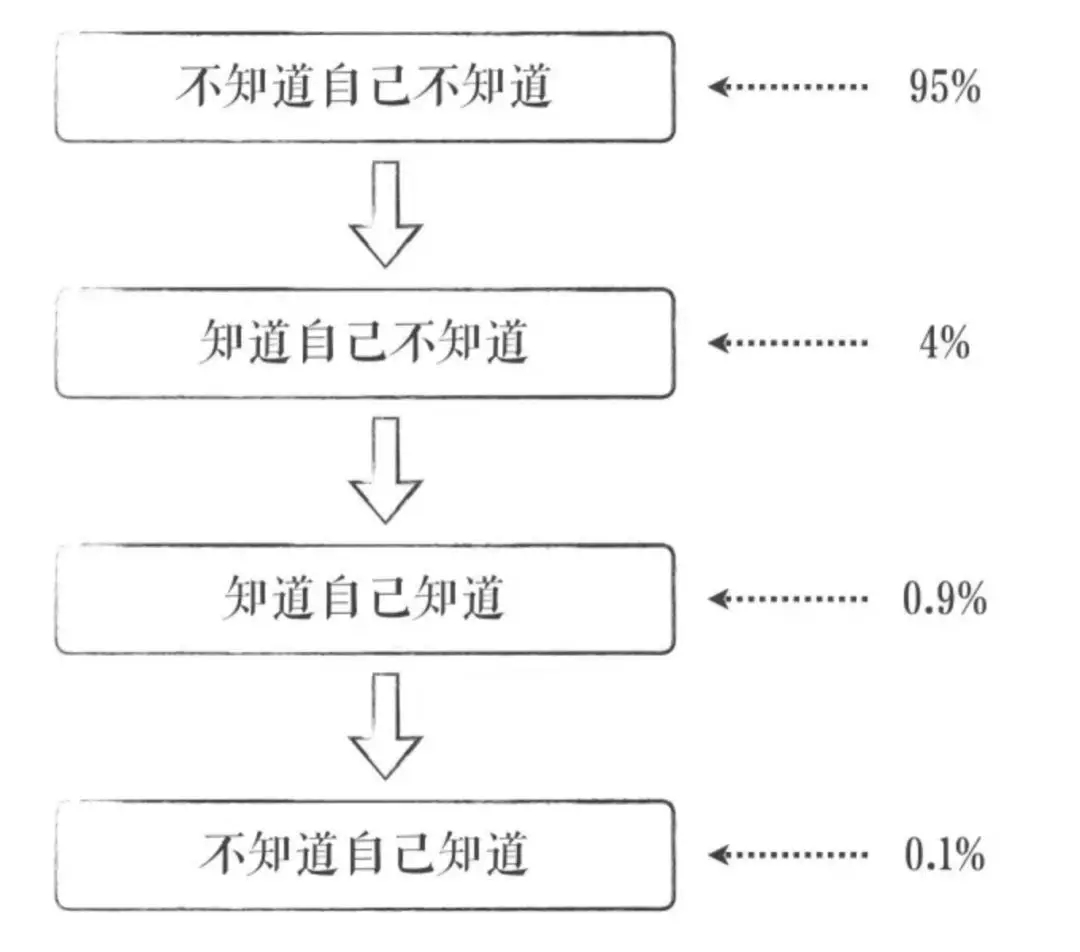 这些人往往处于傅盛说的“不知道自己不知道”的阶段,更可怕的是95%的人处于这个阶段,因此他们也就失去了思维、认知、知识升级的机会。