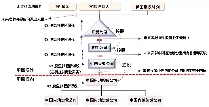 在上述离岸架构下,如果中国香港特殊目的公司至少持有中国内地被投资公司25%股权且是股息的“受益所有人”,则在符合特定规定的情况下,将股息从中国内地汇出到中国香港特殊目的公司有可能适用5%的优惠税率缴纳预提所得税。否则,适用10%的预提所得税税率。中国香港公司分配给BVI公司的股息没有税负,因为中国香港对股息不征收所得税且没有股息预提所得税。BVI公司分配给开曼公司的股息也没有税负,因为BVI对股息不征税。同样的道理,开曼公司分配给实际控制人及其他股东的股息也没有税负。