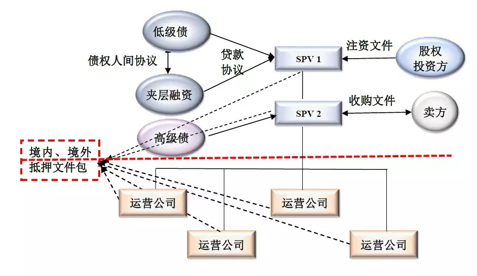 基于各方面的考虑,目前实践中受到广泛欢迎的SPV设立司法管辖区包括英属维尔京群岛、开曼群岛、香港、爱尔兰、卢森堡、荷兰、泽西岛、根西岛等。这些特殊目的公司是收购文件、贷款文件、质押文件、担保文件的签约主体。围绕着这些特殊目的公司,来自各个法域的股权投资者、债权投资者、收购方、被收购方、担保和抵押品提供方将确立非常复杂的合同关系,编制一个非常复杂的合同之网。如下图所示。