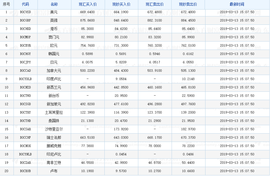 中国银行外汇牌价 2019-03-13(图片来源:东方财富网)