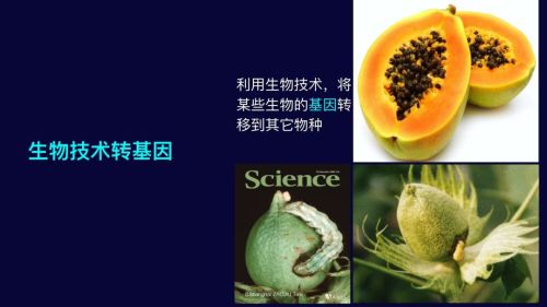 但实际上这些方式产生的变异都是随机的,为了获得更多有益的的遗传变异,便于我们筛选和培育优良的品种,比如说改善农产品的的抗虫性和抗病性等等,我们现在通过最先进的生物技术可以精准地定位我们想要的基因,培育出没有环斑病毒的木瓜,能抗虫的优质棉花……