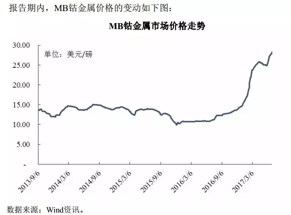 ①未来钴价出现单边快速下跌的可能性较低:随着全球发展新能源汽车的趋势逐渐明朗,对乘用车采用三元动力电池的技术路线逐渐明确,动力电池领域钴消费量有望逐年攀升,全球钴价从2016年下半年开始一轮新的上涨周期;