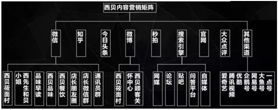 此外,西贝在内容营销上也是做得较为成功,西贝在线上各渠道,共有1200万的缔约用户,为了与这1200万用户互动西贝组建了一个自媒体矩阵。