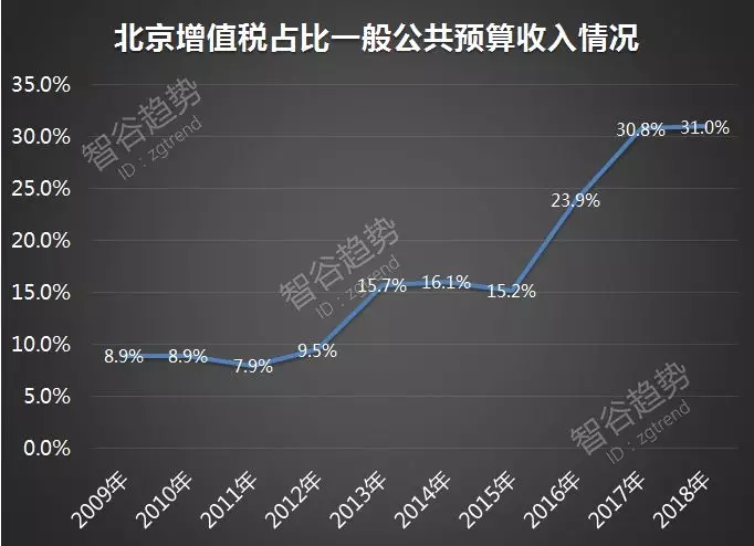 在帝都的钱袋子里,增值税一直是扛把子的地位。这两年占比一般公共预算收入超过 30%。