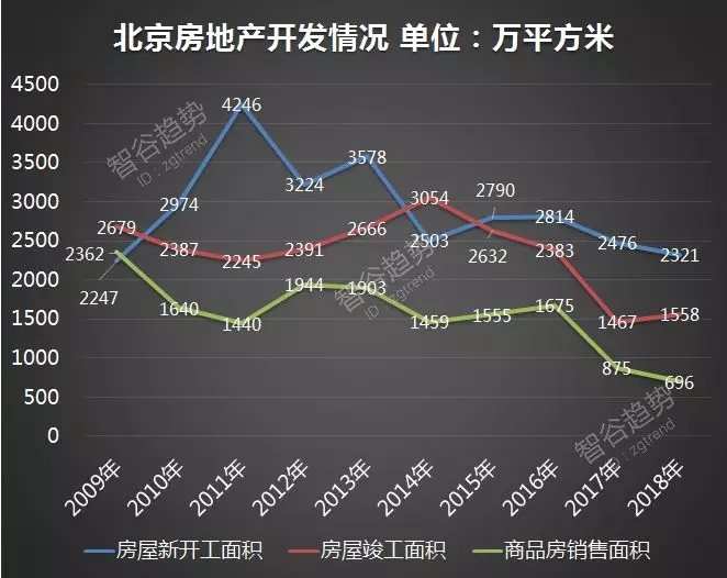 (自2016年北京率先开启新一轮调控后,房屋新开工面积、竣工面积、销售面积大幅下滑)