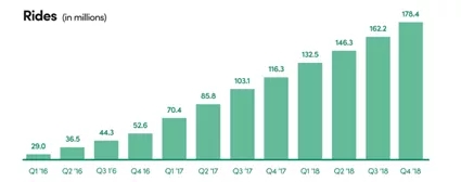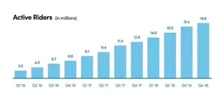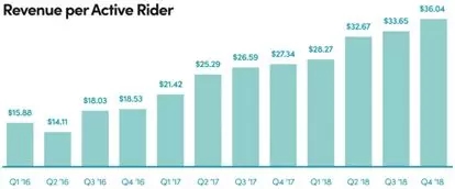 招股书显示,近三年Lyft的活跃用户、客单价、乘车车次都不断增长。截至2018年底,Lyft活跃用户人数为1,860万人,几乎是2016年底人数(660万人)的三倍。且客单价不断增长,2018年达到36.04美元,2016年末这一数值仅为18.53美元,增长近一倍。另外,Lyft的乘车车次也不断增长,2018年第四季度已经达到1.78亿次