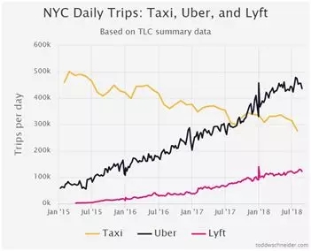 而如今,网约车的发展已经进入到对地铁公交等公共交通系统进行替代的阶段。在纽约市居民及观光客人数虽持续增加的背景下,MTA 数据显示,在2015年纽约市达到自1948年以来的最高峰,而2017年载客量为17.3亿人次,较2015年减少了2%,巴士载客量2018年前七个月的载客量已减少近4.5%。纽约市地铁官员表示,地铁载客量流失的情形集中在Uber 及其他叫车 App 蓬勃发展的曼哈顿周围行政区。