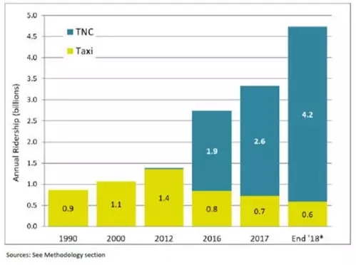 总体来看,共享出行市场爆发性增长。据市场研究机Pew Research Center发布的最新数据显示,在过去3年中美国市场上网约车服务的使用量翻了3倍。2017年,美国共享出行服务的人次达到26亿,同比增长37%,2018年,这个数字预计会到42亿,同比增长62%。