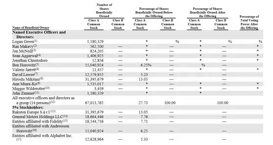 招股文件显示,经过多轮巨额融资后,Lyft创始人洛根•格林(Logan Green)和约翰•齐默(John Zimmer)股份被大幅稀释,均仅持1,180,329股,不足1%,Lyft整体管理层IPO前占股27.73%,日本电子商务巨头乐天(Rakuten) 拥有Lyft 13%的股份,为第一大机构股东,预计也将成为此次ipo的最大赢家。