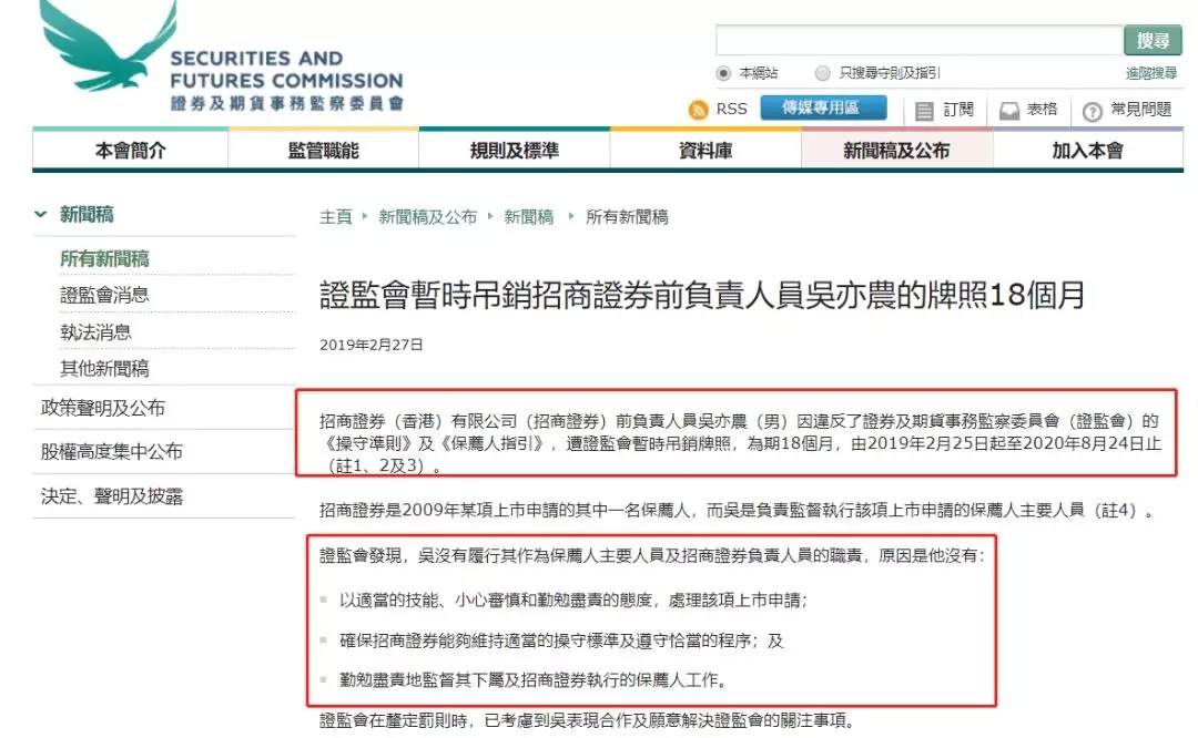 香港证监会最新公告显示,招商证券(香港)前负责人员吴亦农因违反了证券及期货事务监察委员会(证监会)的“操守准则”及“保荐人指引”,遭证监会暂时吊销牌照,为期18个月,由2019年2月25日起至2020年8月24日止。