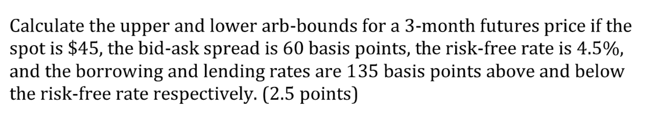 本题可按套利步骤一步一步做,比如假设先借45刀买入现货,然后在期货市场进入一个卖方foward contract,3个月到期出售现货。期货价格必须等于45+付的利息+spread, 不然有套利机会。这个也就是期货价格公式推导过程。