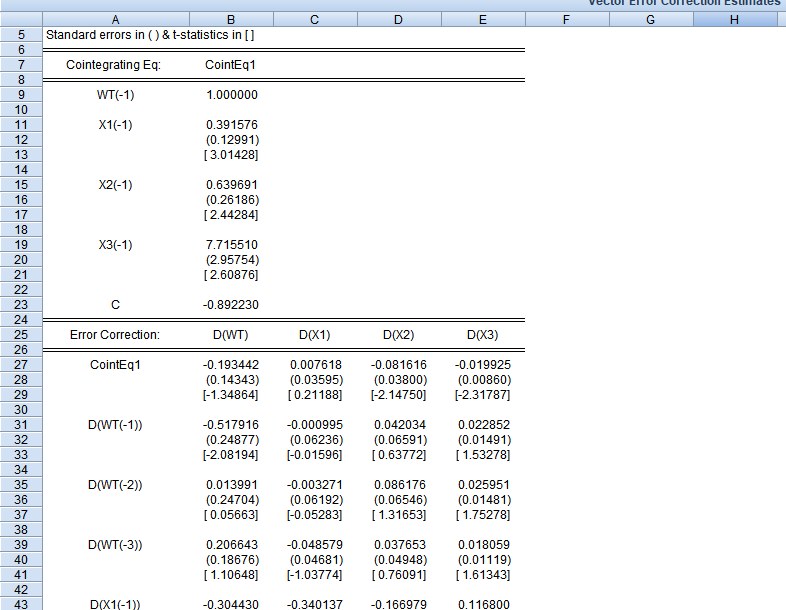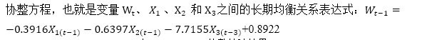 最后的johansen协整和VECM结果如图,协整方程如第二张图这么写对吗?但是这么写的话就意味着换手率与波动呈负相关,这好像是违背正常规律的,而且换手率变动1%,上证波动7%这个数值也好像有点太高了。