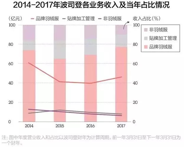 事实也证明,对于波司登而言,得羽绒服者得天下,重新回归羽绒服后效果立现:2017财年,经过此前的一番调整后,羽绒服的营收占到波司登总营收的76.6%,在羽绒服业务的带动下,公司的其他的业务指标也跟着好转。