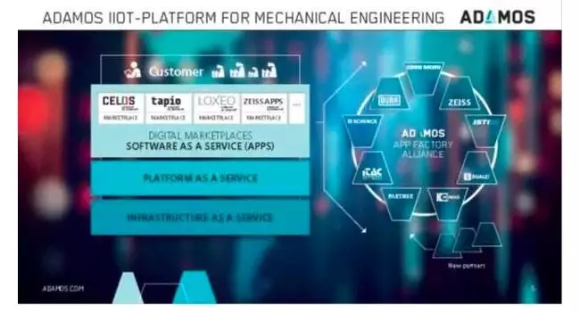 工业4.0就是一个德国企业以全新法则重新形成国家品牌抱团的机会。而从德国的实践来看,德国制造界也并没有打算认真地区分,工业4.0和工业互联网的区别。一切都是围绕着机器的极致效率、数据的价值萃取而来。工业互联网平台的发展,也是如此。最有代表性的当属德国ADMOS联盟组织。这是面向机械制造商和工厂工程部门的工业物联网平台,提供自适应地开放式制造解决方案(ADAptive Manufacturing Open Solutions)。ADAMOS的发起者是一个Softeware AG牵头,它联合了机床厂商德马吉森精机,汽车涂装设备杜尔、光电子器件制造商蔡司,以及贴片机商ASM共四家机械制造及工程技术公司,成立机械工程和信息技术战略联盟,ADAMOS将机械工程、生产和信息技术的知识捆绑在一起,并致力于建立行业的全球标准。