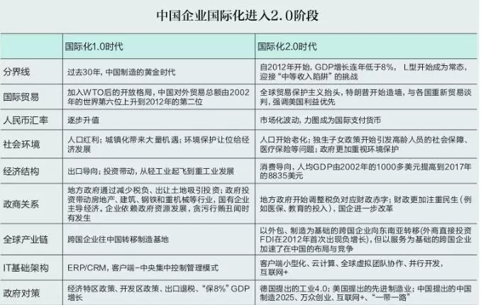 规模越大,影响也越大,责任也越大。我们通过表“中国企业国际化进入2.0阶段”,比较中国企业国际化1.0时代与2.0时代的差别。