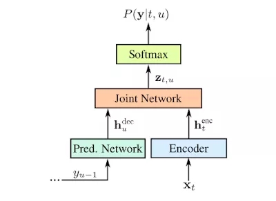 输出符号是字母表的字符。RNN-T 会逐个输出字符,并在适当的位置输入空格。它通过反馈循环执行此操作,该训练将模型预测的符号反馈到其中以预测下一个符号。如下图所示。