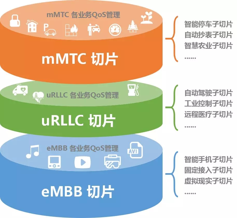 最后,经过无线,承载和核心网这些纵向子切片的协同工作,为端到端的横向切片:eMBB、mMTC和uRLLC提供支撑,不同的业务得以在不同的切片之上畅行。