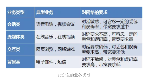 于是,一帮专家们对所有用户的各种类型的业务进行了充分研究之后,根据不同业务对时延、丢包率的不同要求进行了如下的分类: