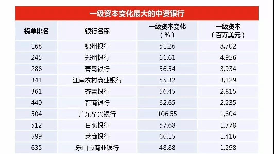 从排名来看,按照一级资本总额排名,今年入围前十的银行名单与去年相比并无变化,只是在排位上有微小差别,其中,农业银行排名由去年的全球第6位升至第4位。榜单中,锦州银行、江苏银行、浙商银行、重庆农村商业银行、光大银行和北京银行等上升较快,均提升超过10个位次。此外,几家中国银行第一次进入全球1000强榜单,包括葫芦岛银行、朝阳银行、石嘴山银行、马鞍山农村商业银行和泰安银行。