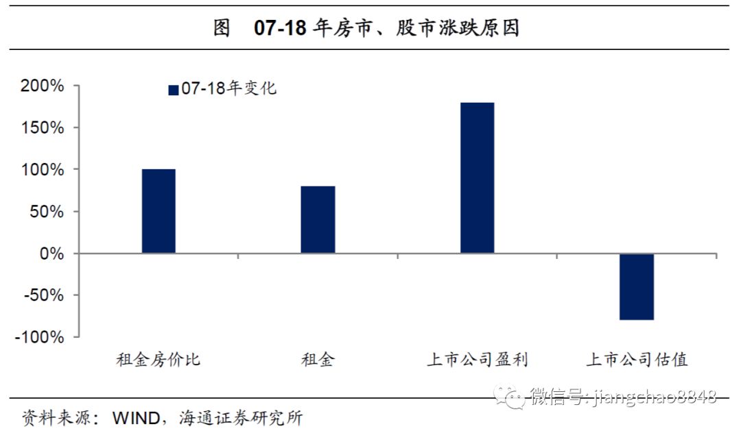 从07年到18年,房价大涨的背后,源于中国一线城市房价租金比代表的房市估值上涨100%,而来自租金的涨幅只有80%。而同期中国A股上市公司的盈利增长了180%,但由于上证指数的估值从55倍下降至10倍左右、降幅高达80%,所以导致股市依旧大幅下跌了一半。