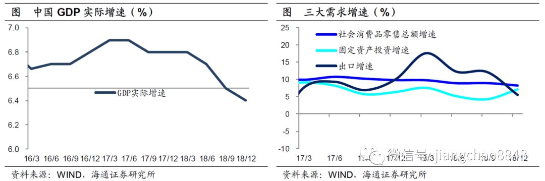 本轮经济下滑:始于18年2季度。观察本轮中国经济增速的变化,我们发现其回落始于18年2季度左右。从GDP增速来看,在17年3季度到18年1季度都维持在6.8%的增速,但在18年2季度增速降至6.7%,此后的两个季度增速又分别降至6.5%和6.4%。从支出法来看,三大需求的下滑均出现在18年2季度。其中消费增速从9.8%降至9%,投资增速从7.6%降至5.2%,出口增速从17.6%降至12.3%。