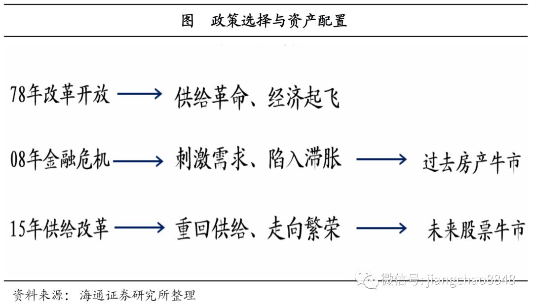 从凯恩斯到里根:美国80年代股市、房市大逆转。美国在60、70年代也曾经历房价飞涨、股市近20年不涨。但80年至今,却是股债长牛、房产跑输现金。其原因在于,70年代美国靠凯恩斯主义刺激需求,结果产生了滞胀,货币超发对房价有利,而高利率抑制了股市估值。而里根在80年以后将政策转向供给学派,一是收缩了货币增速、大幅降低了利率水平,这对房市不利而对股市有利,二是大幅减税,提高了企业盈利,两者共同带来40年美股大牛市。中国穷则思变:从4万亿刺激到供给侧改革。中国过去房价大涨,源于08年4万亿之后走上了举债发展之路,货币超发直接推高房价,而由此导致的高利率对股市不利。但是由于债务率见顶,我们也在15年转向了供给侧结构性改革,这其实类似于美国里根的供给学派改革,因此也会带来资产配置的巨大变化。